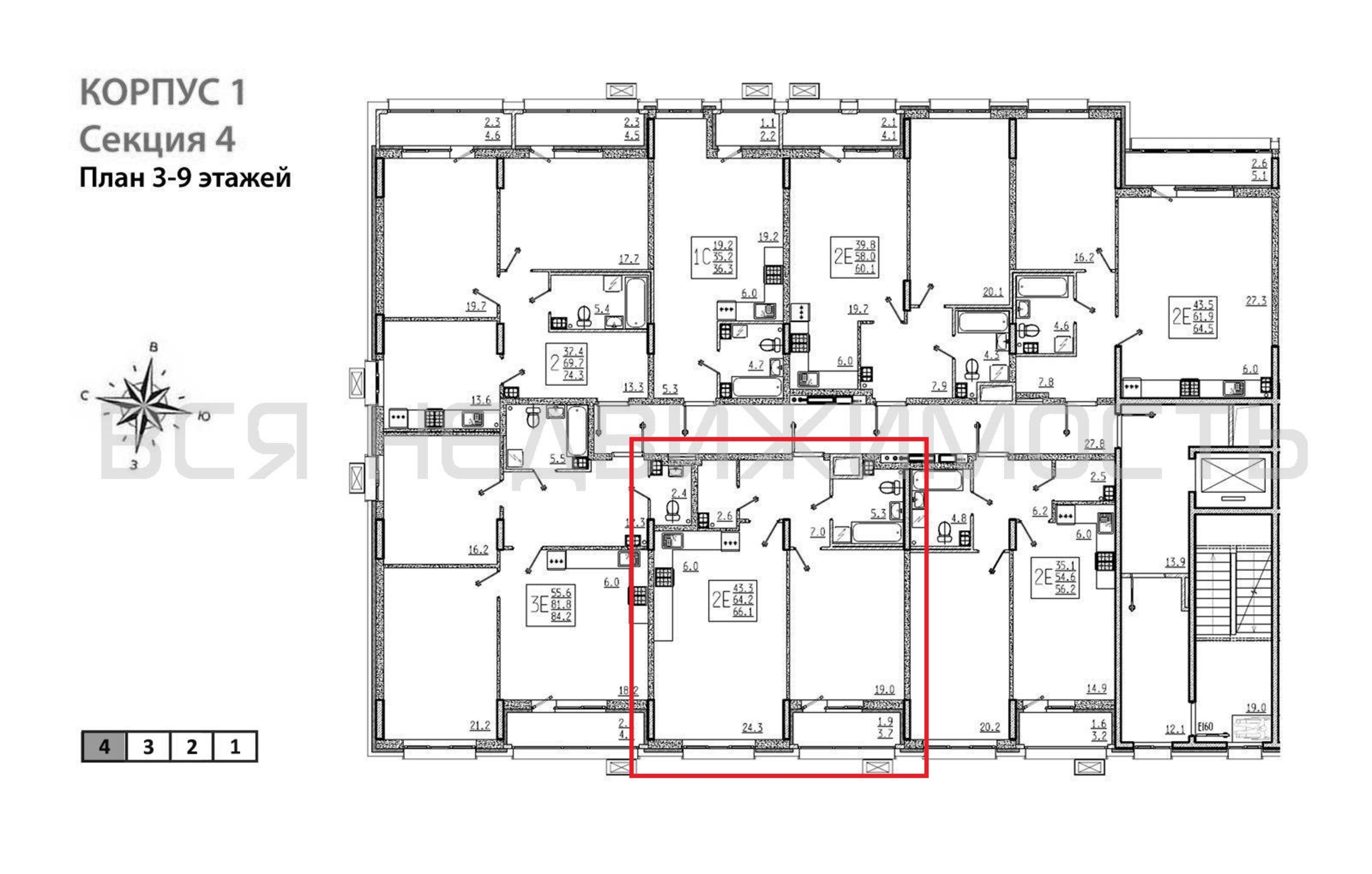 1-комнатная квартира, 66.10 м² 8/9 этаж ID объекта 100137286