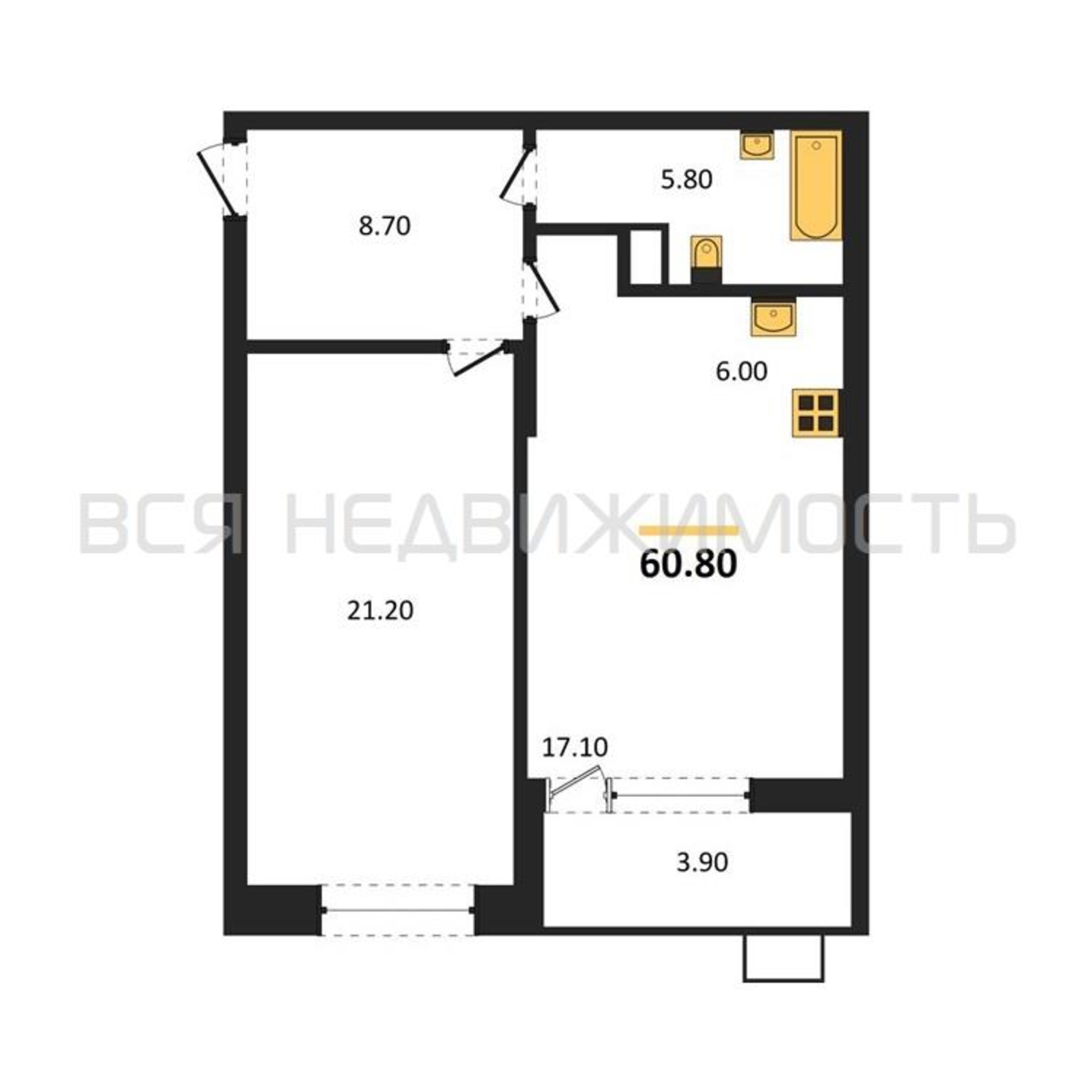 1-комнатная квартира, 60.80 м² 9/9 этаж ID объекта 100137420