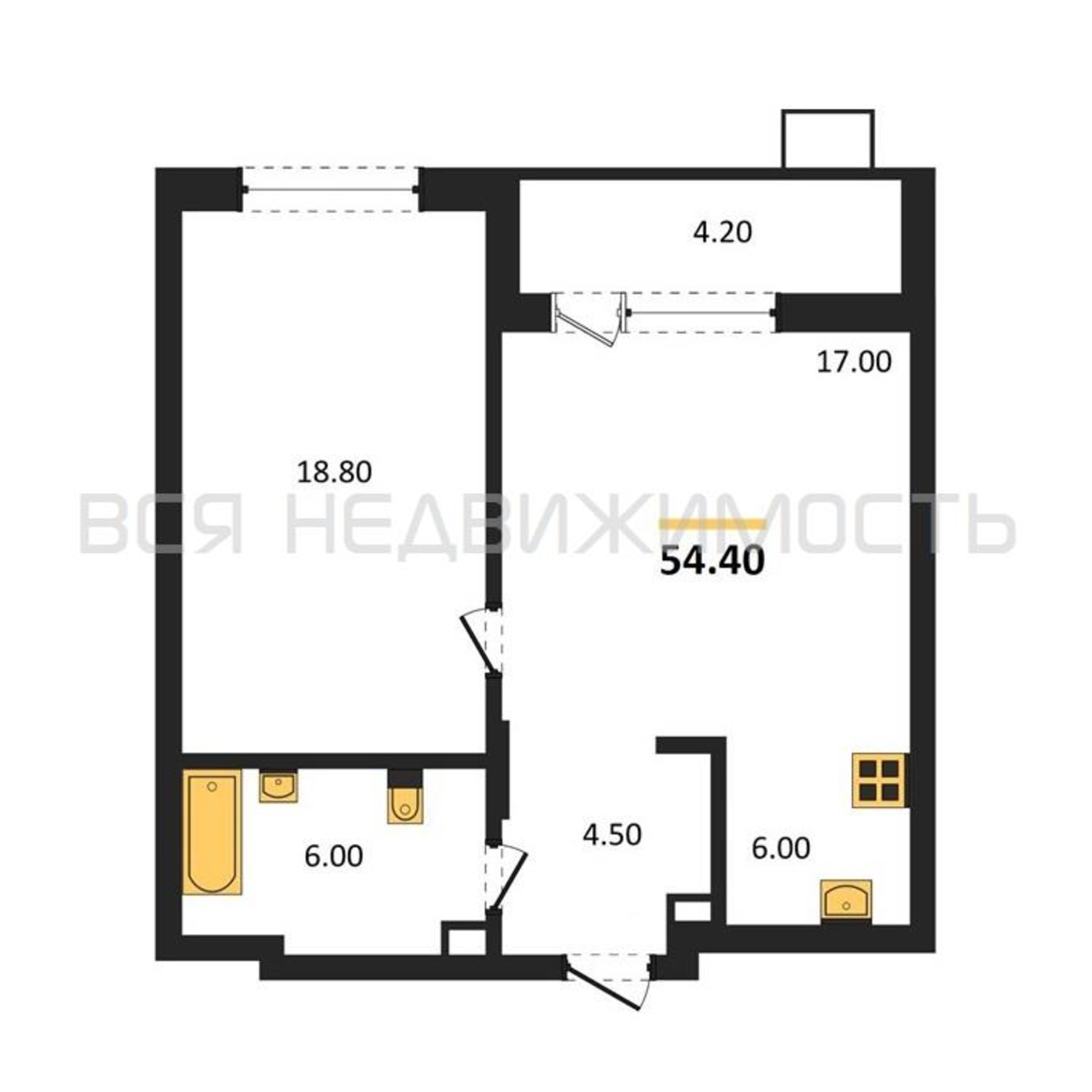 1-комнатная квартира, 54.40 м² 4/9 этаж ID объекта 100137449