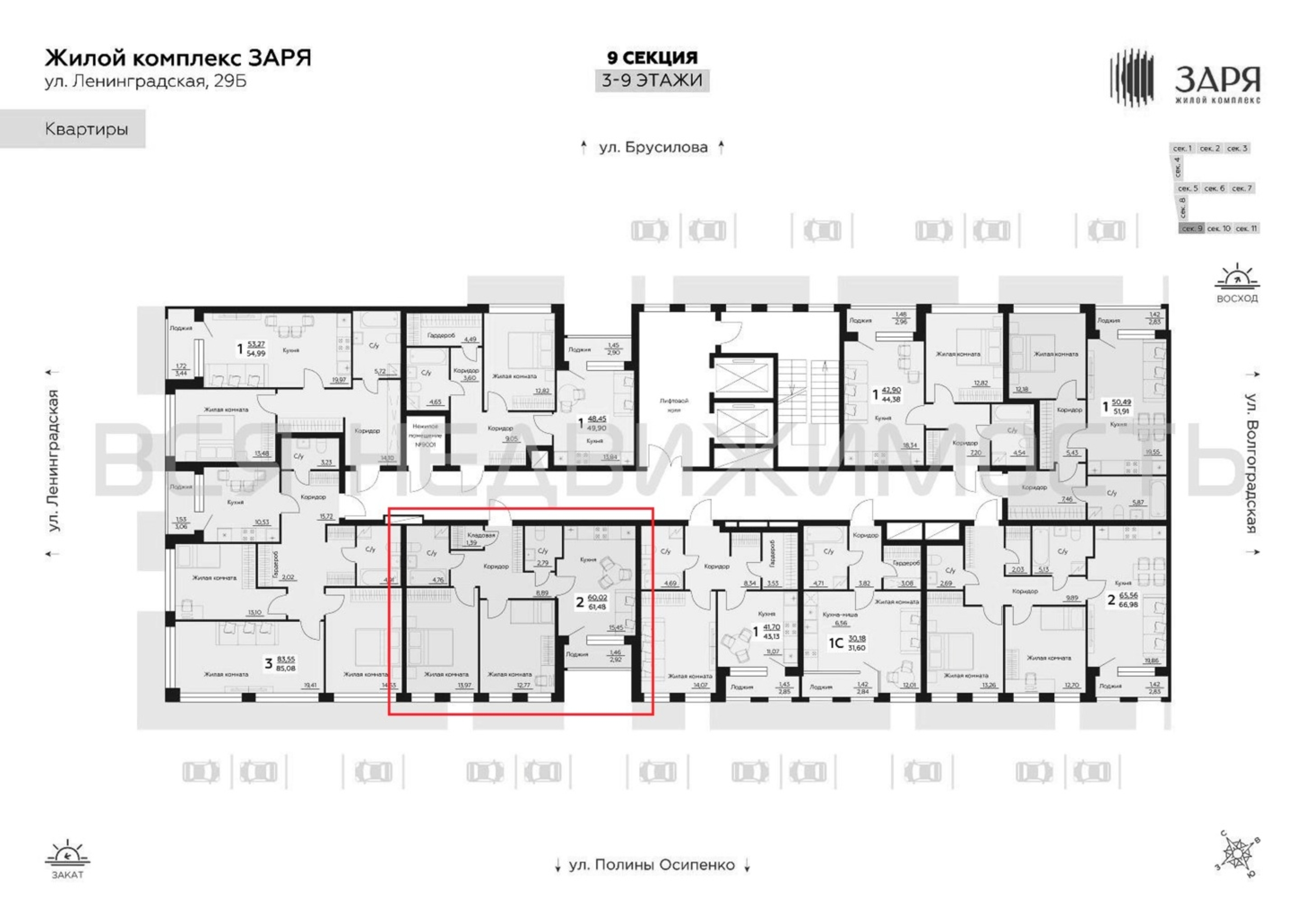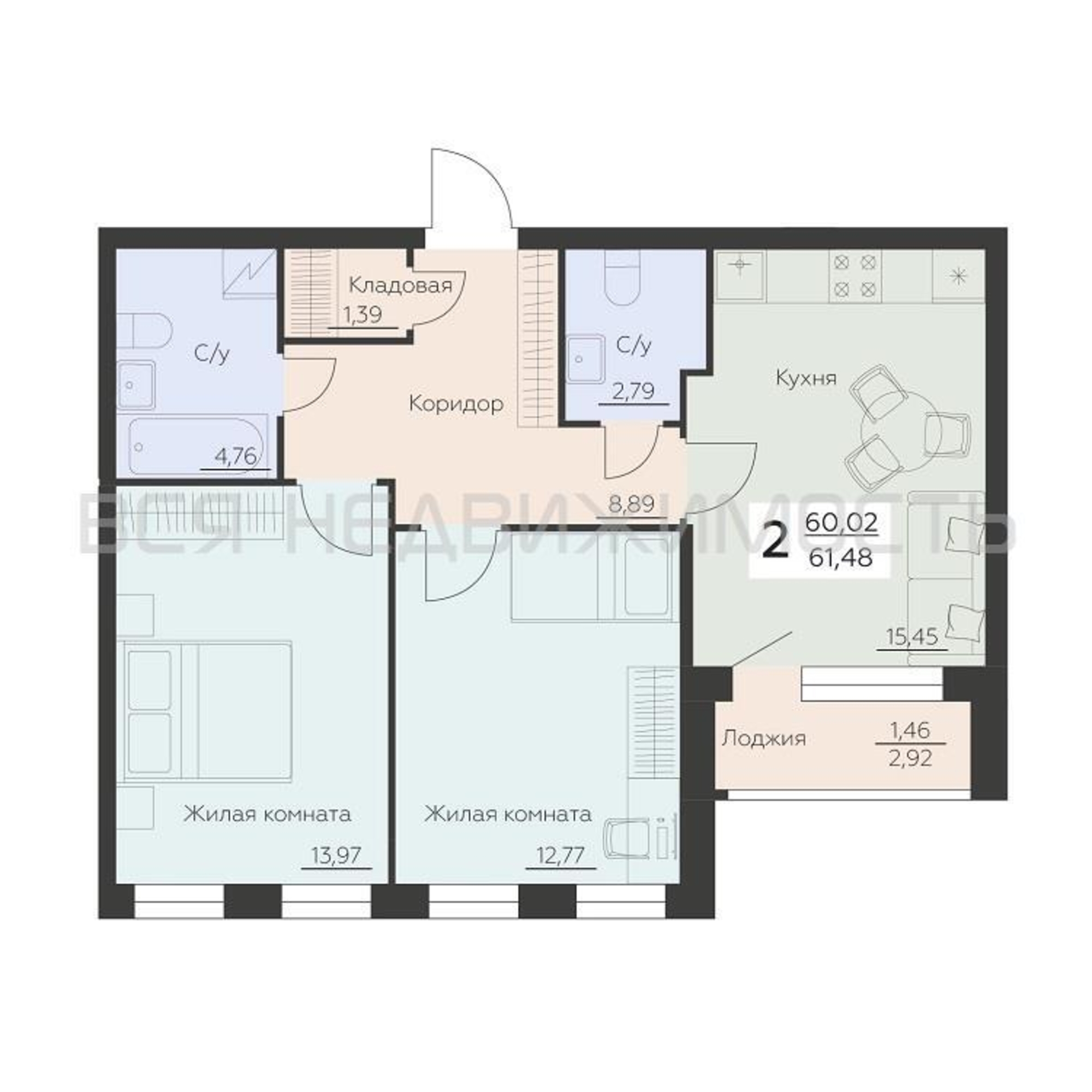 2-комнатная квартира, 61.48 м² 6/16 этаж ID объекта 100137965