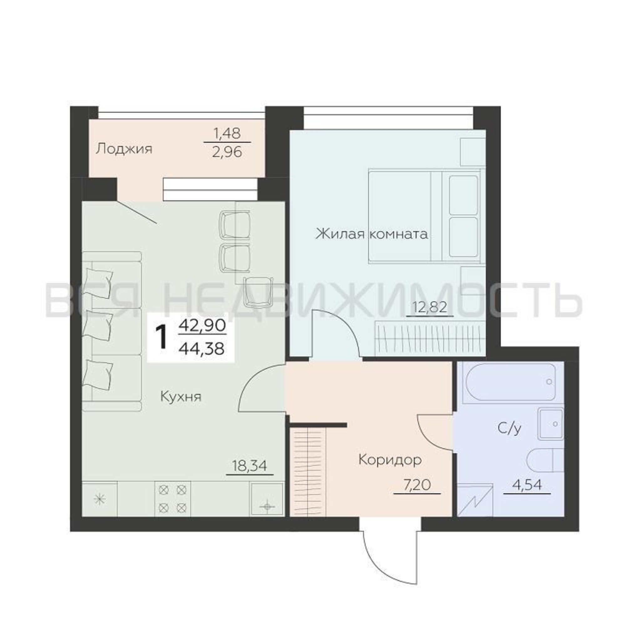 1-комнатная квартира, 44.38 м² 7/16 этаж ID объекта 100137969