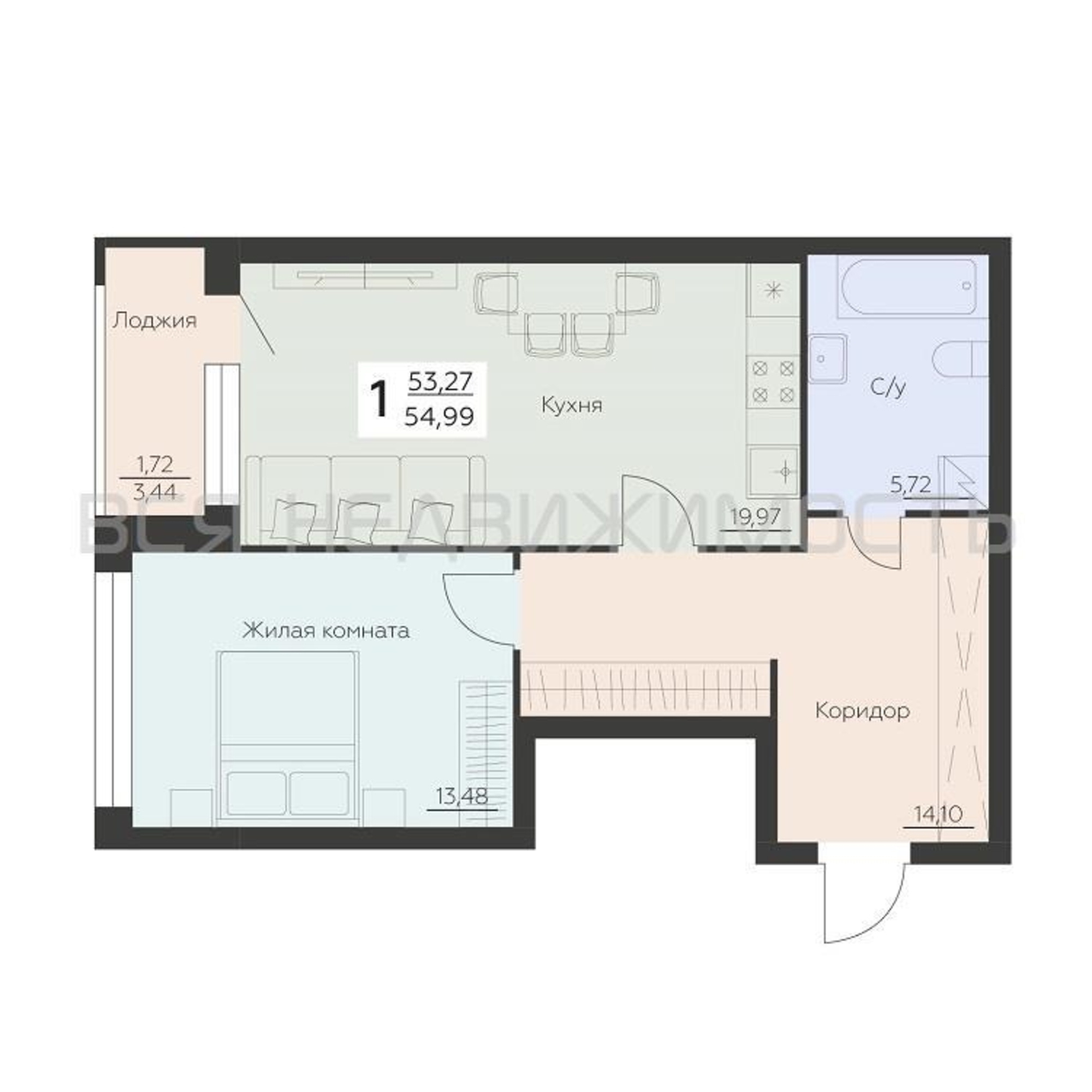 1-комнатная квартира, 54.99 м² 11/16 этаж ID объекта 100138012
