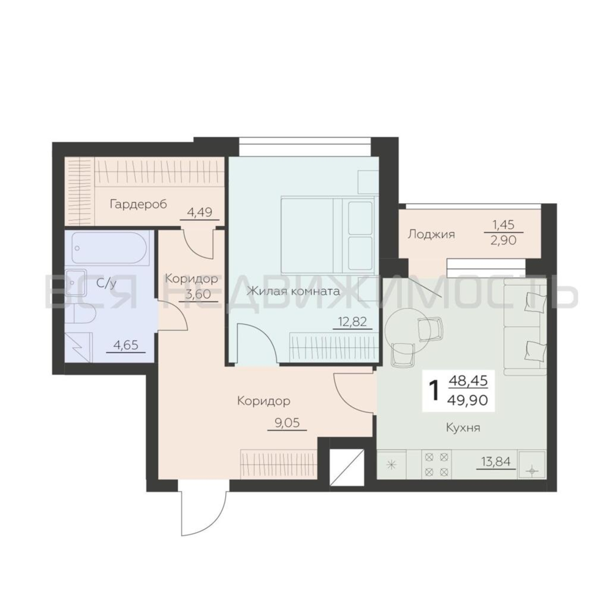 1-комнатная квартира, 49.90 м² 12/16 этаж ID объекта 100138022