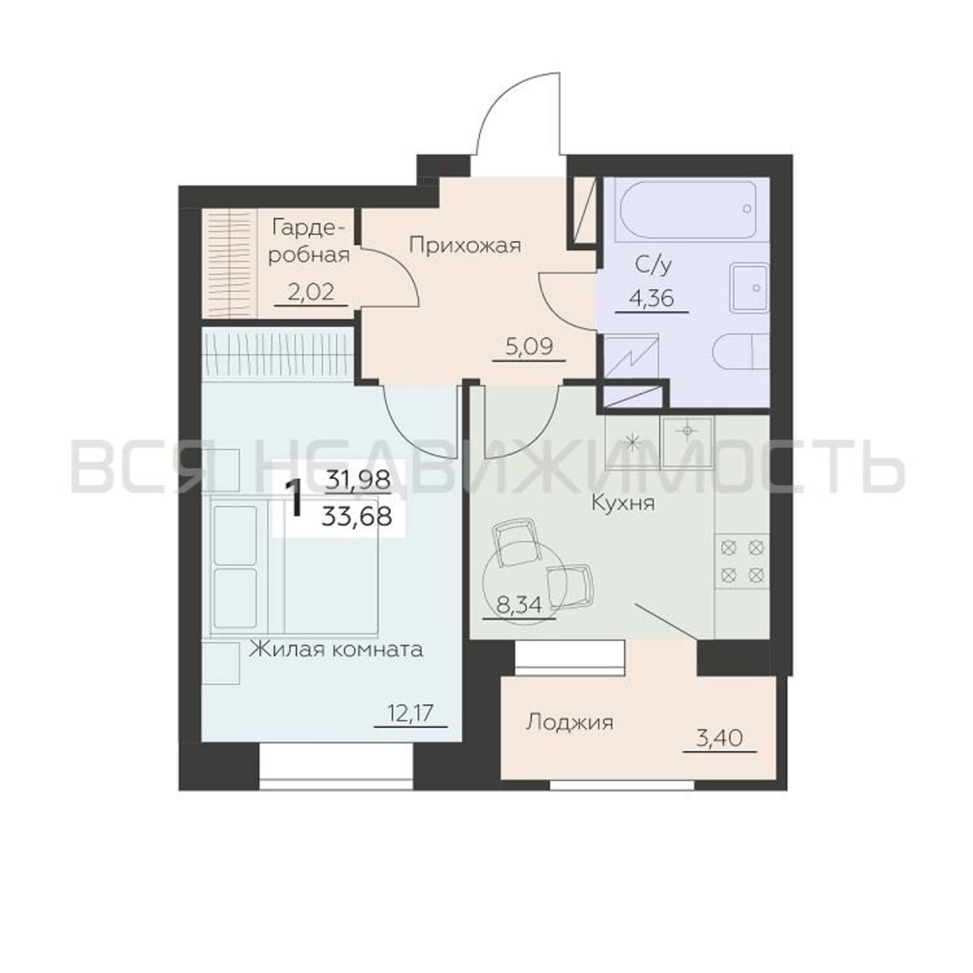 1-комнатная квартира, 33.68 м² 6/14 этаж ID объекта 100138154