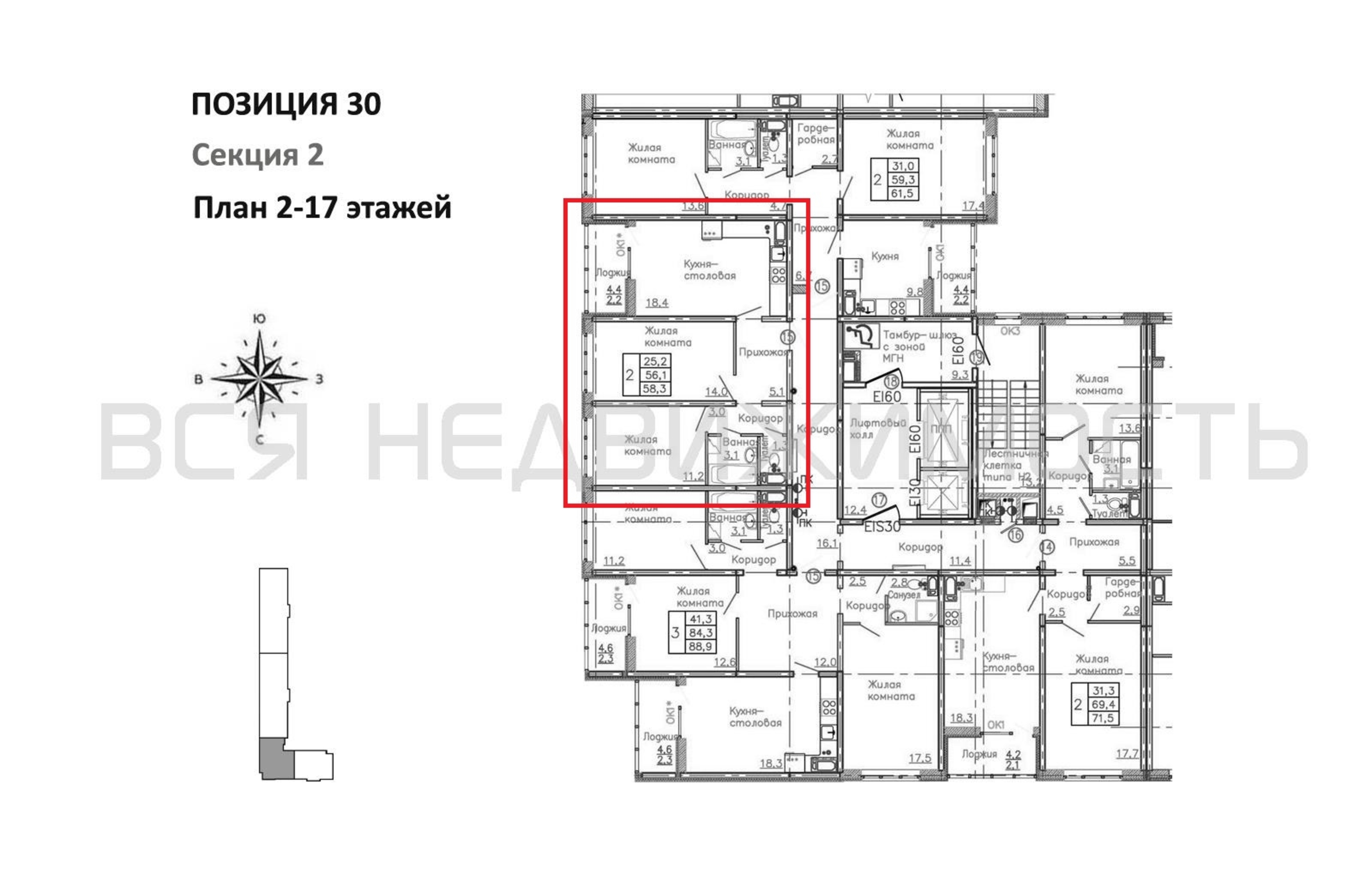2-комнатная квартира, 58.30 м² 14/17 этаж ID объекта 100138347