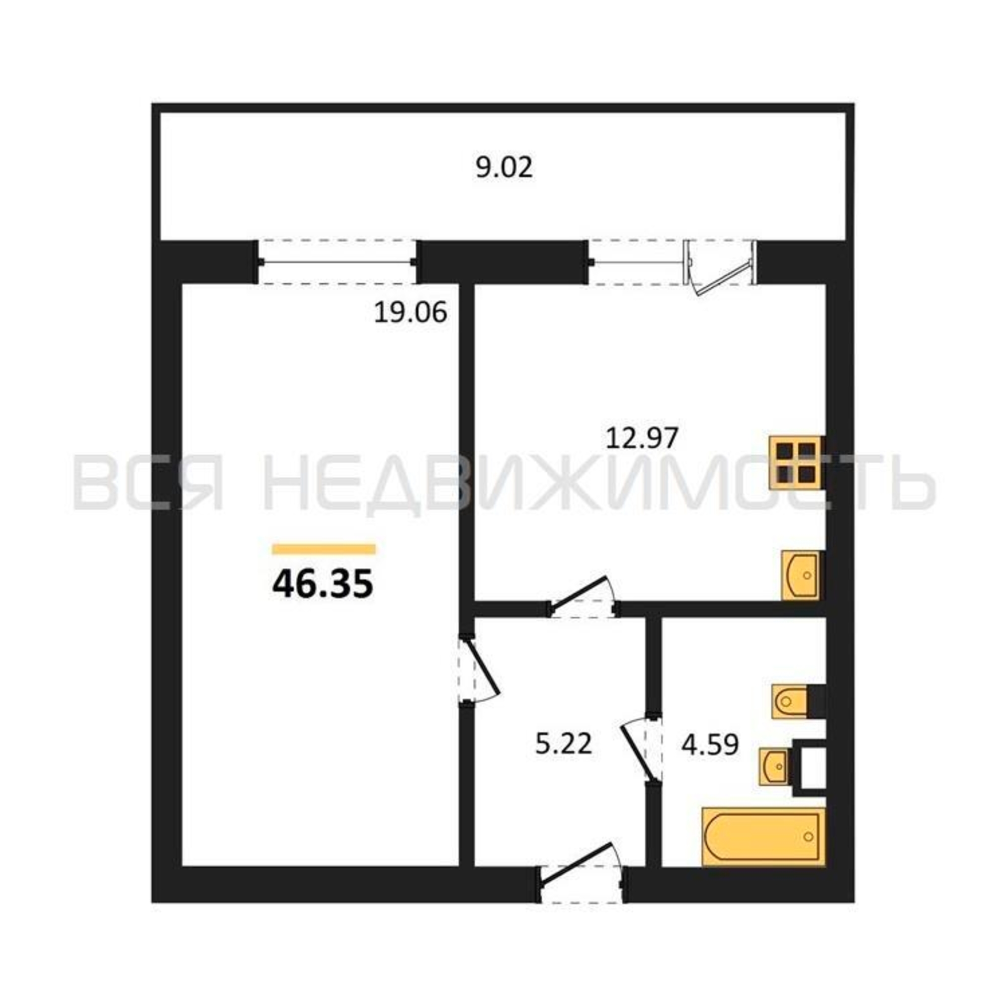 1-комнатная квартира, 46.35 м² 2/16 этаж ID объекта 100138595