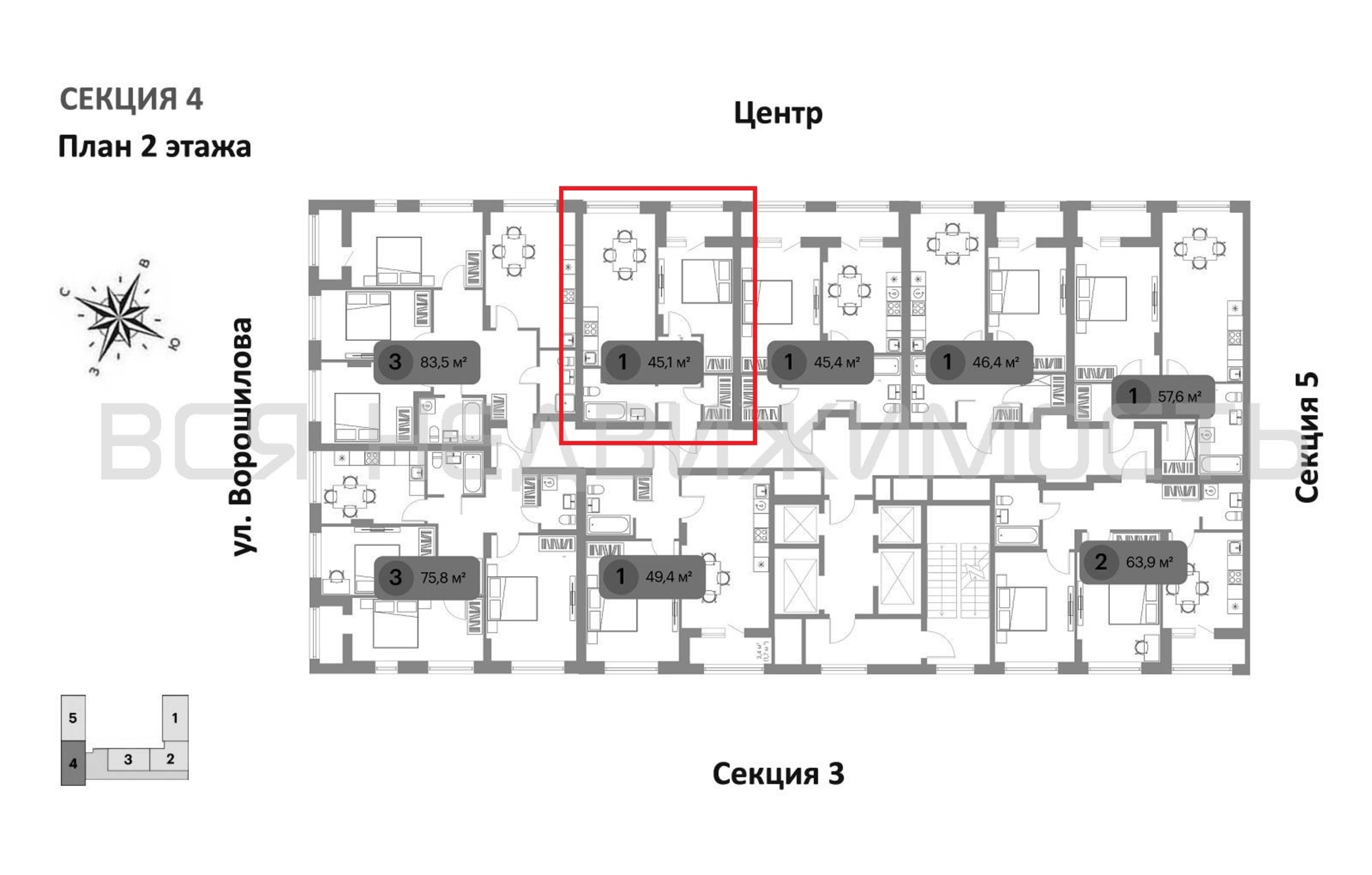 1-комнатная квартира, 45.10 м² 2/23 этаж ID объекта 100139166