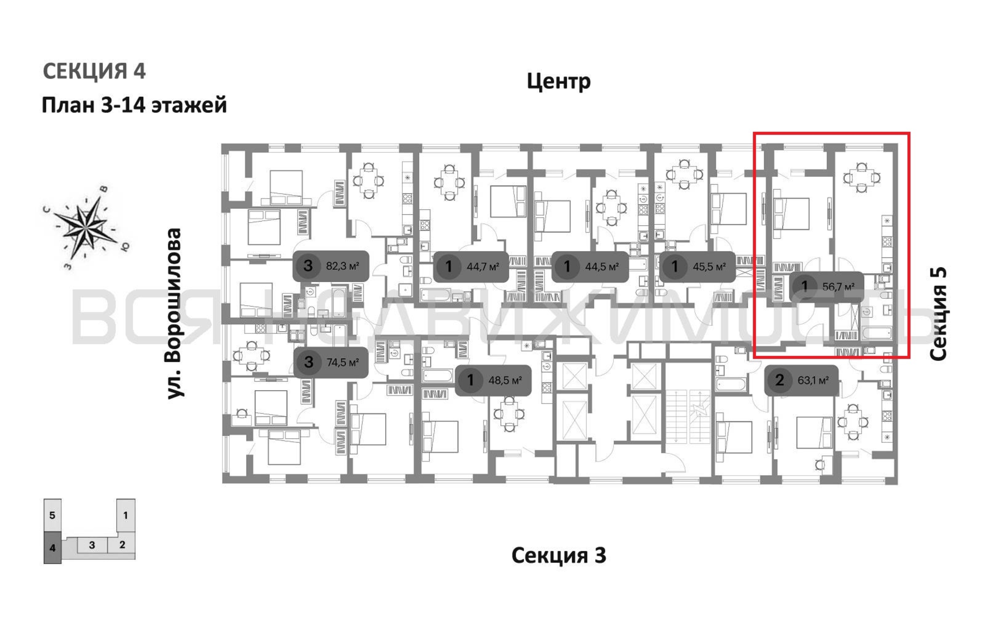 1-комнатная квартира, 56.80 м² 4/23 этаж ID объекта 100139185