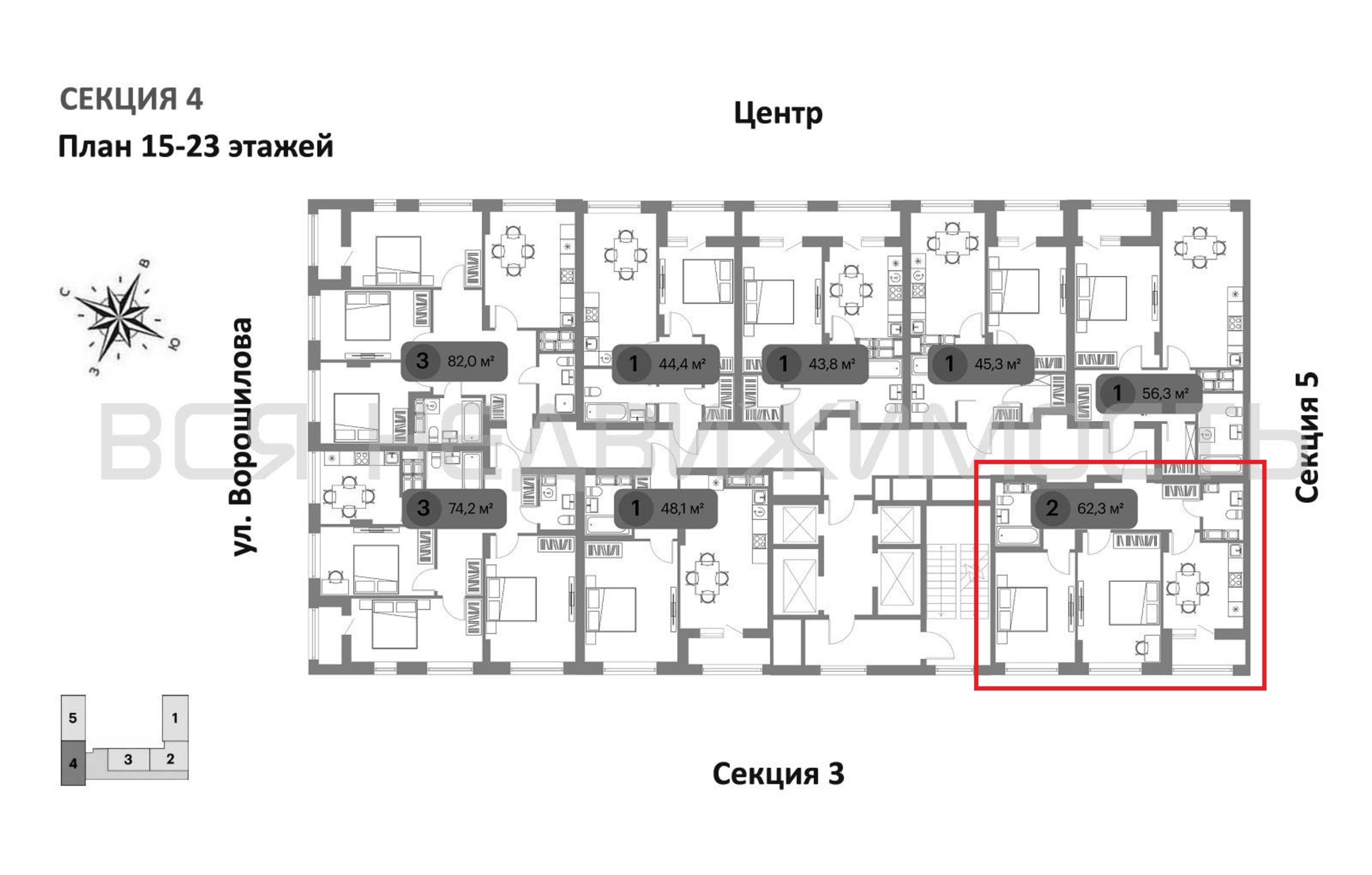 2-комнатная квартира, 62.40 м² 16/23 этаж ID объекта 100139282