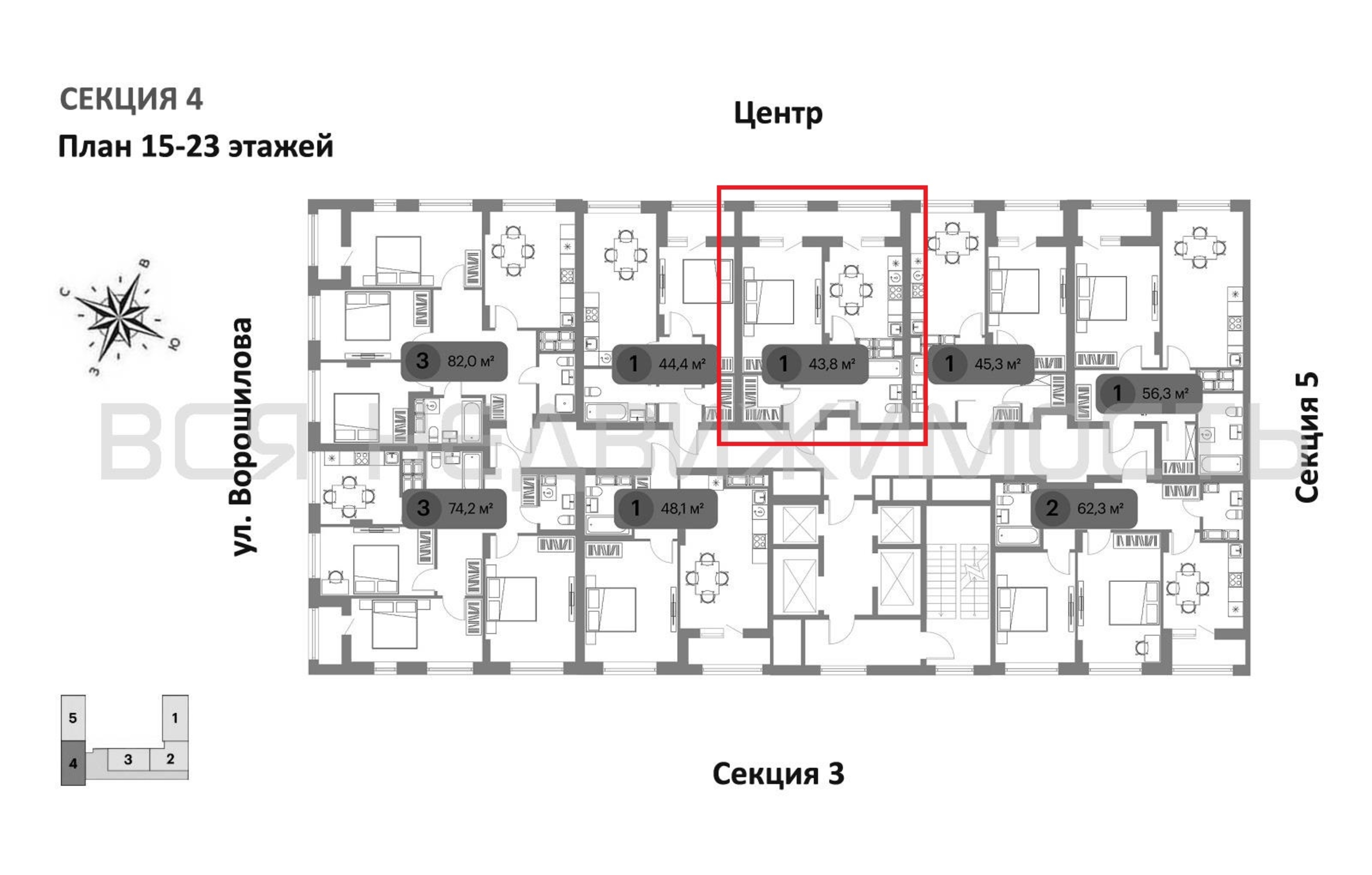 1-комнатная квартира, 43.80 м² 20/23 этаж ID объекта 100139311