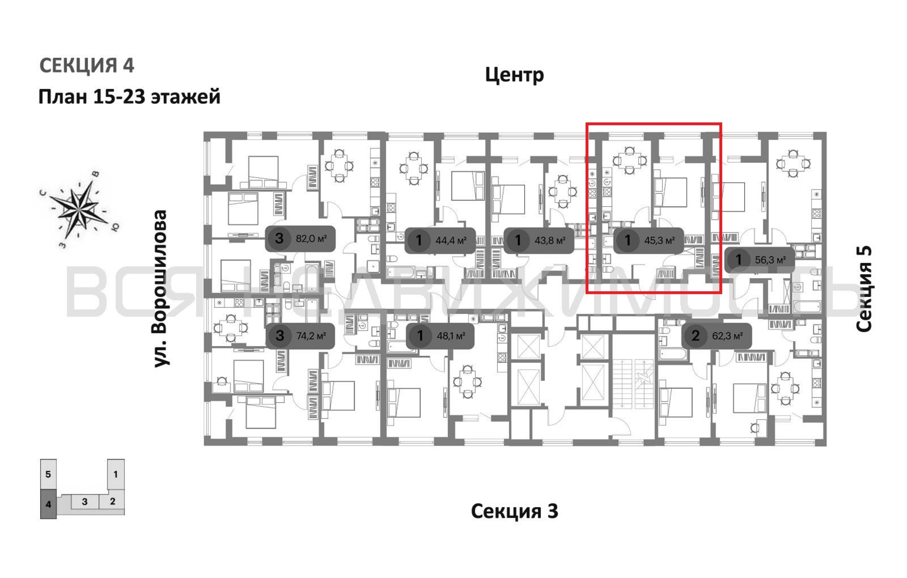 1-комнатная квартира, 45.30 м² 22/23 этаж ID объекта 100139328