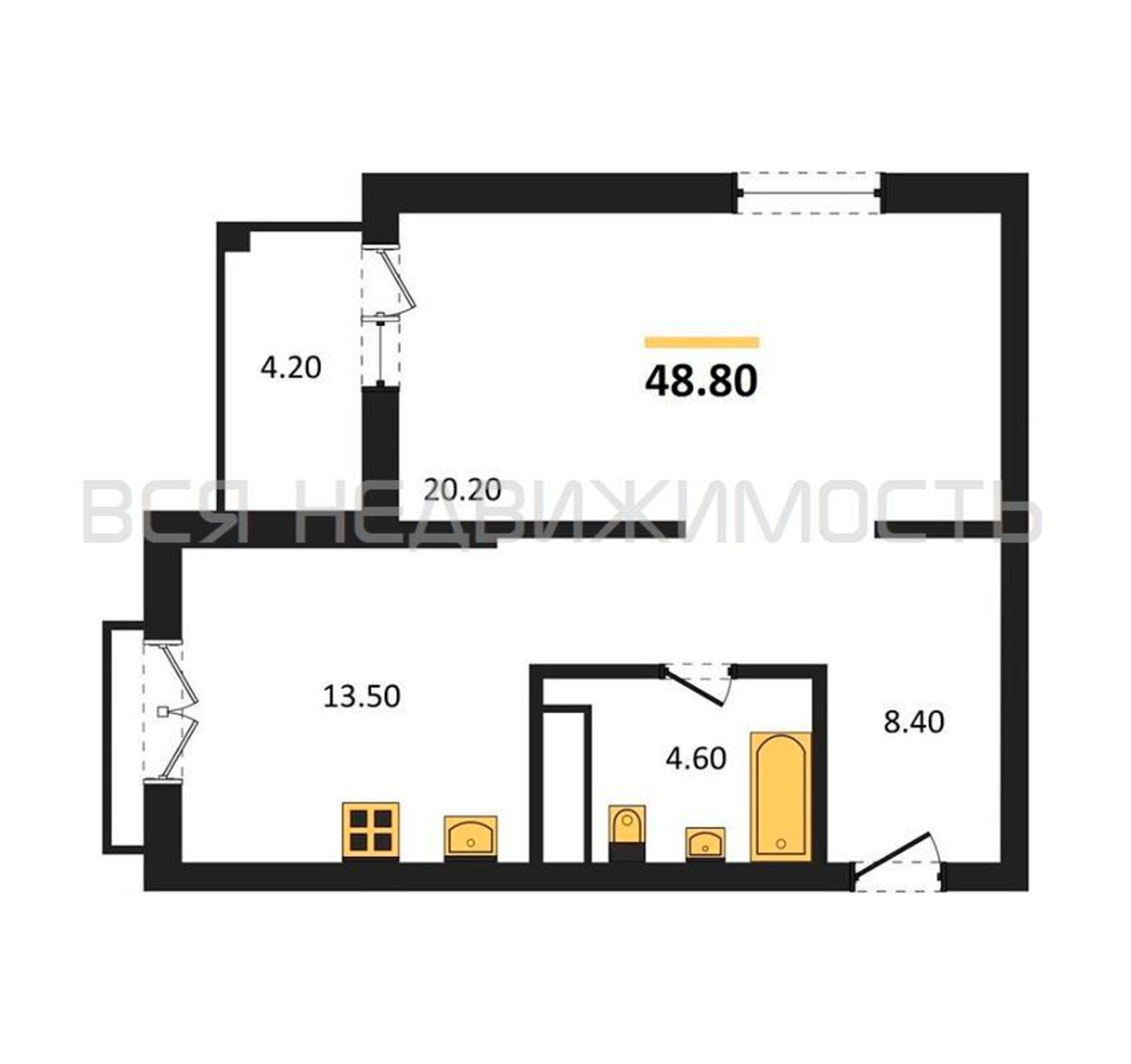 1-комнатная квартира, 48.80 м² 3/8 этаж ID объекта 100139676