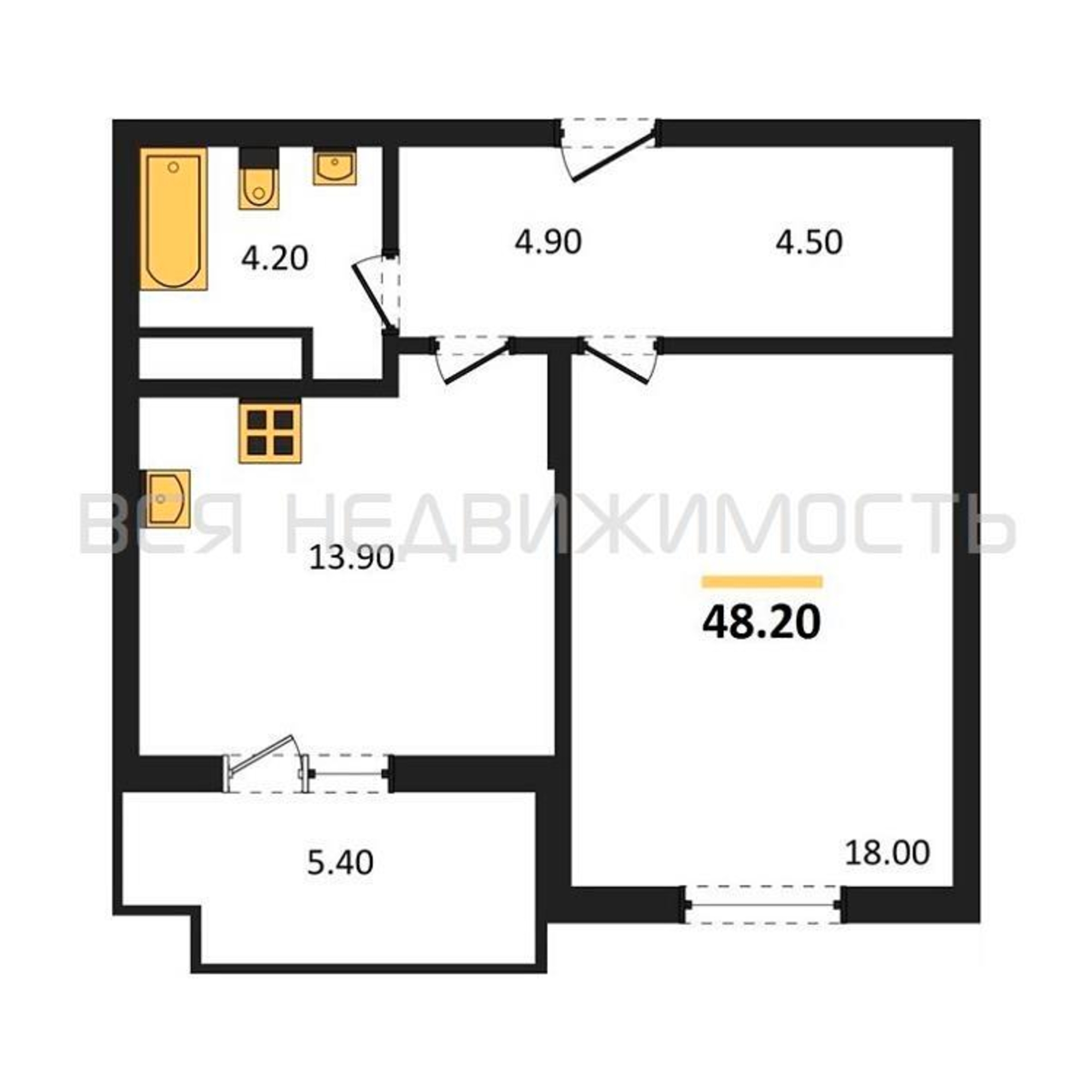 1-комнатная квартира, 48.20 м² 6/8 этаж ID объекта 100139773