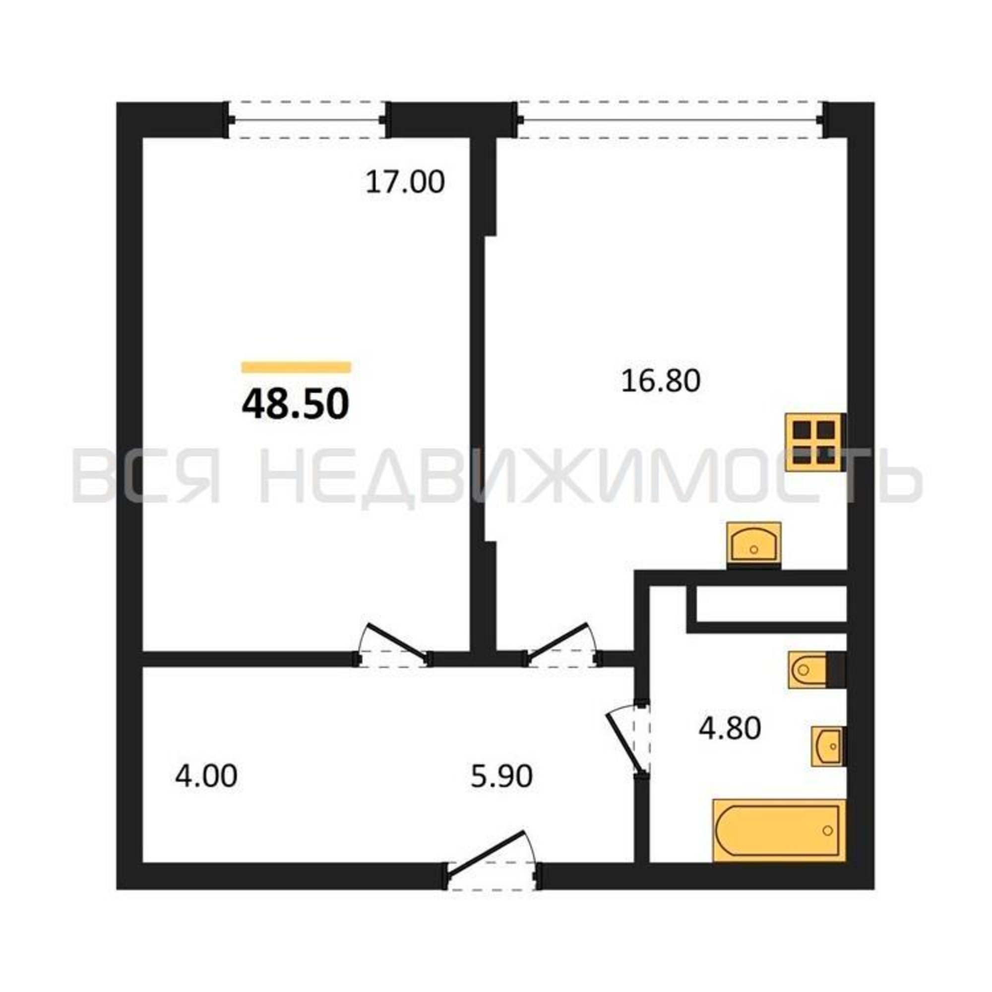 1-комнатная квартира, 48.50 м² 6/8 этаж ID объекта 100139777