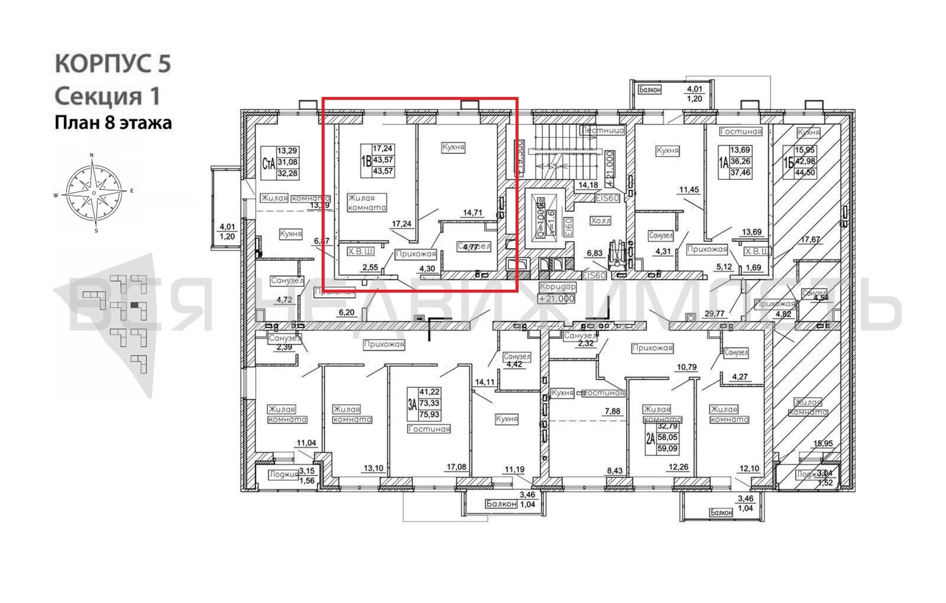 1-комнатная квартира, 43.57 м² 8/10 этаж ID объекта 59264