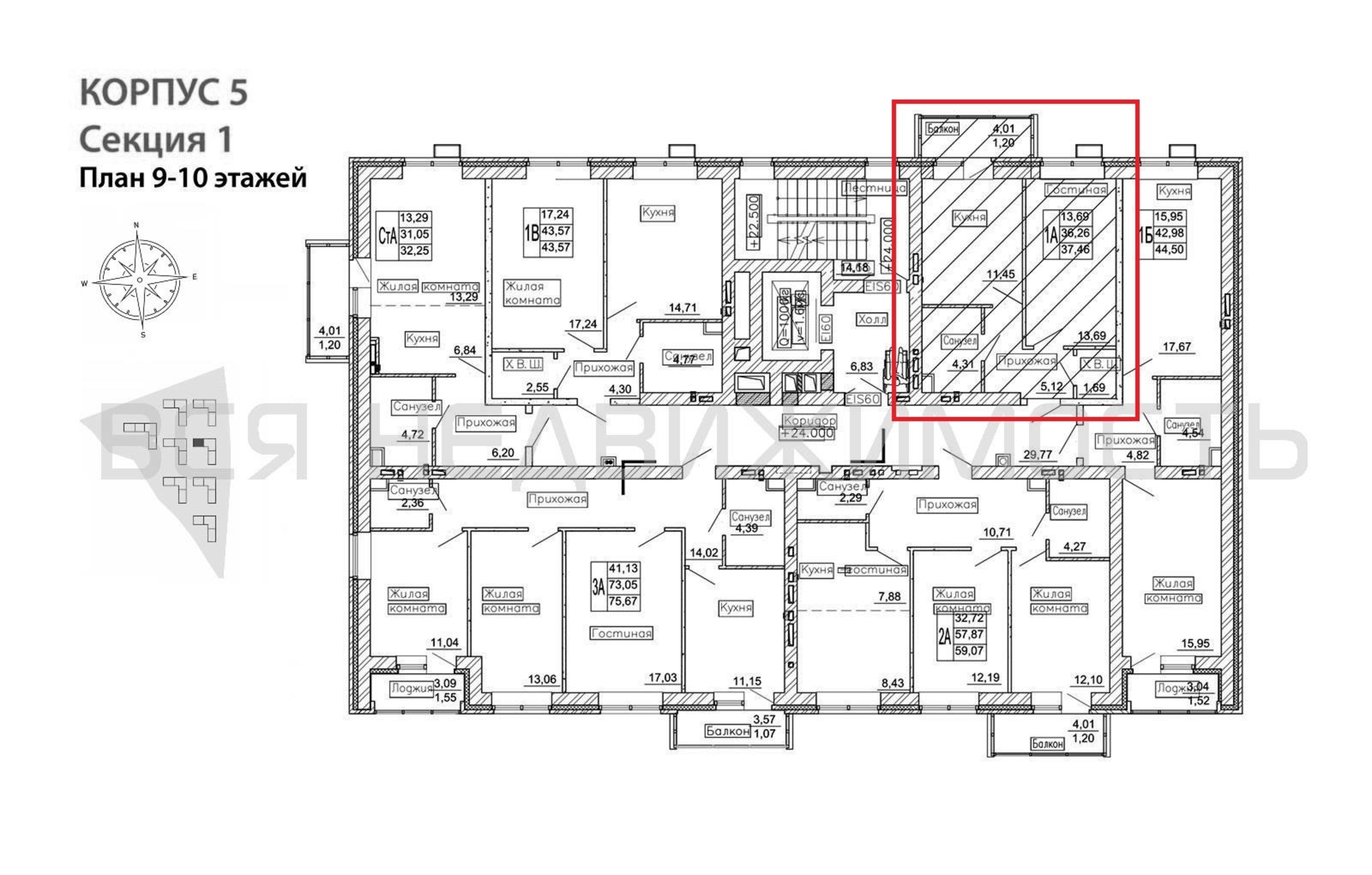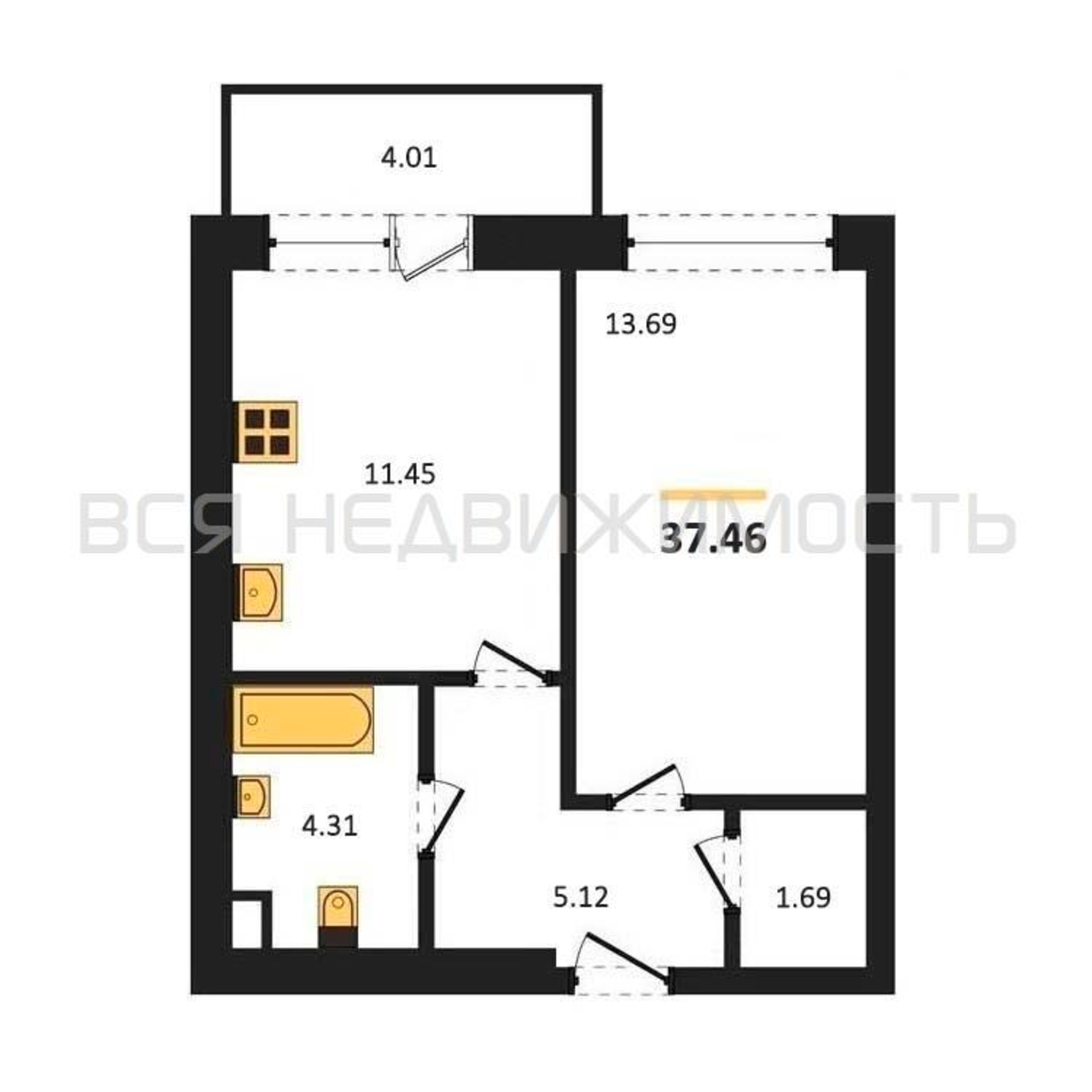 1-комнатная квартира, 37.46 м² 10/10 этаж ID объекта 59270