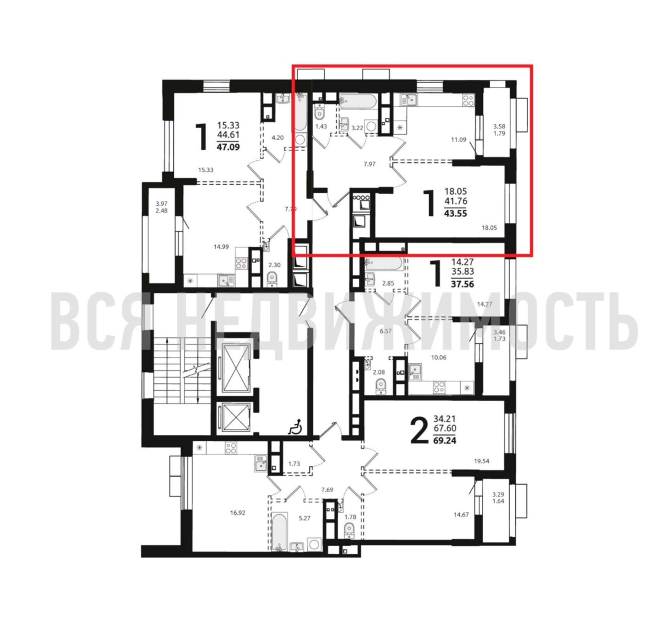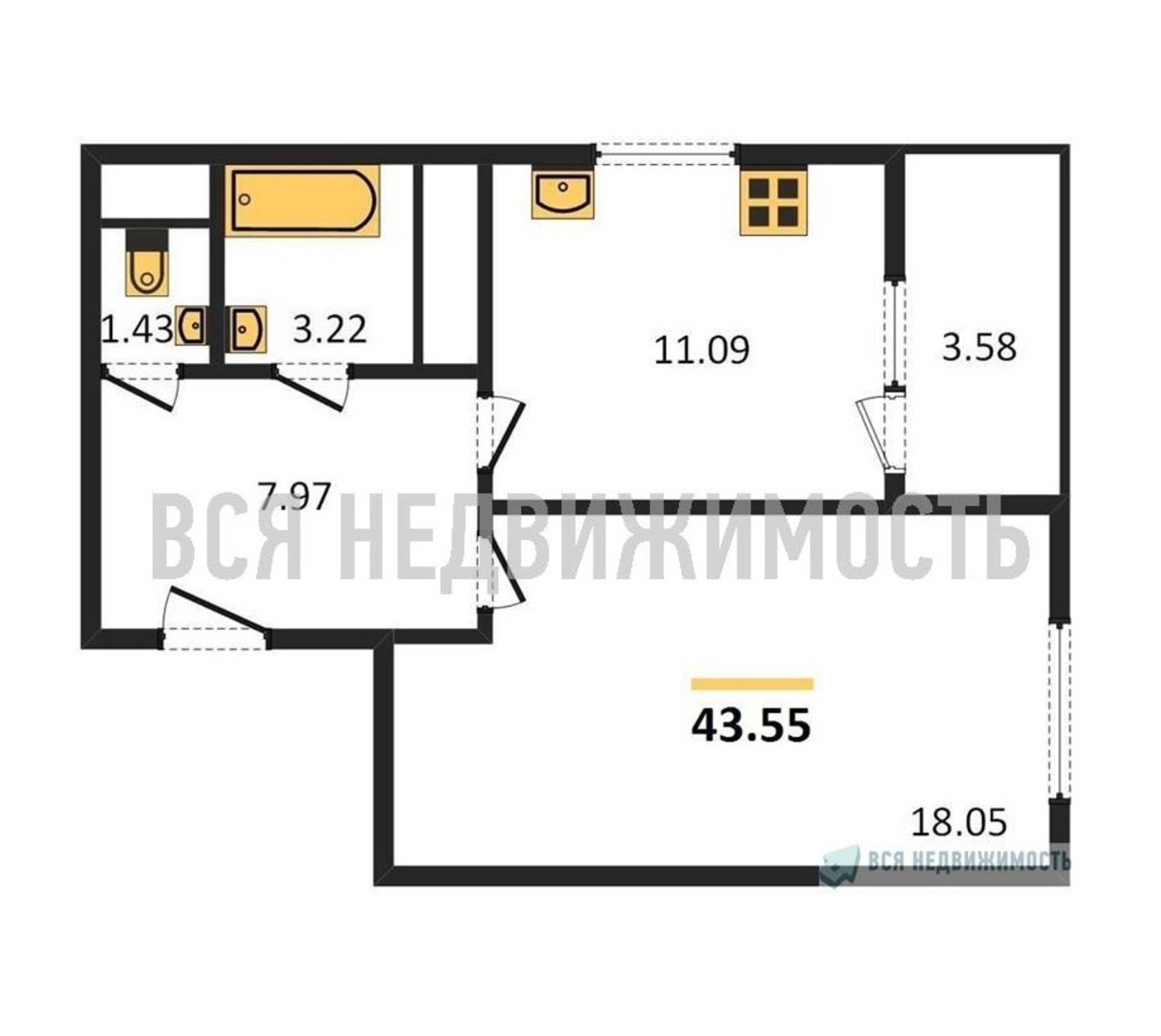 1-комнатная квартира, 43.55 м² 2/12 этаж ID объекта 73673
