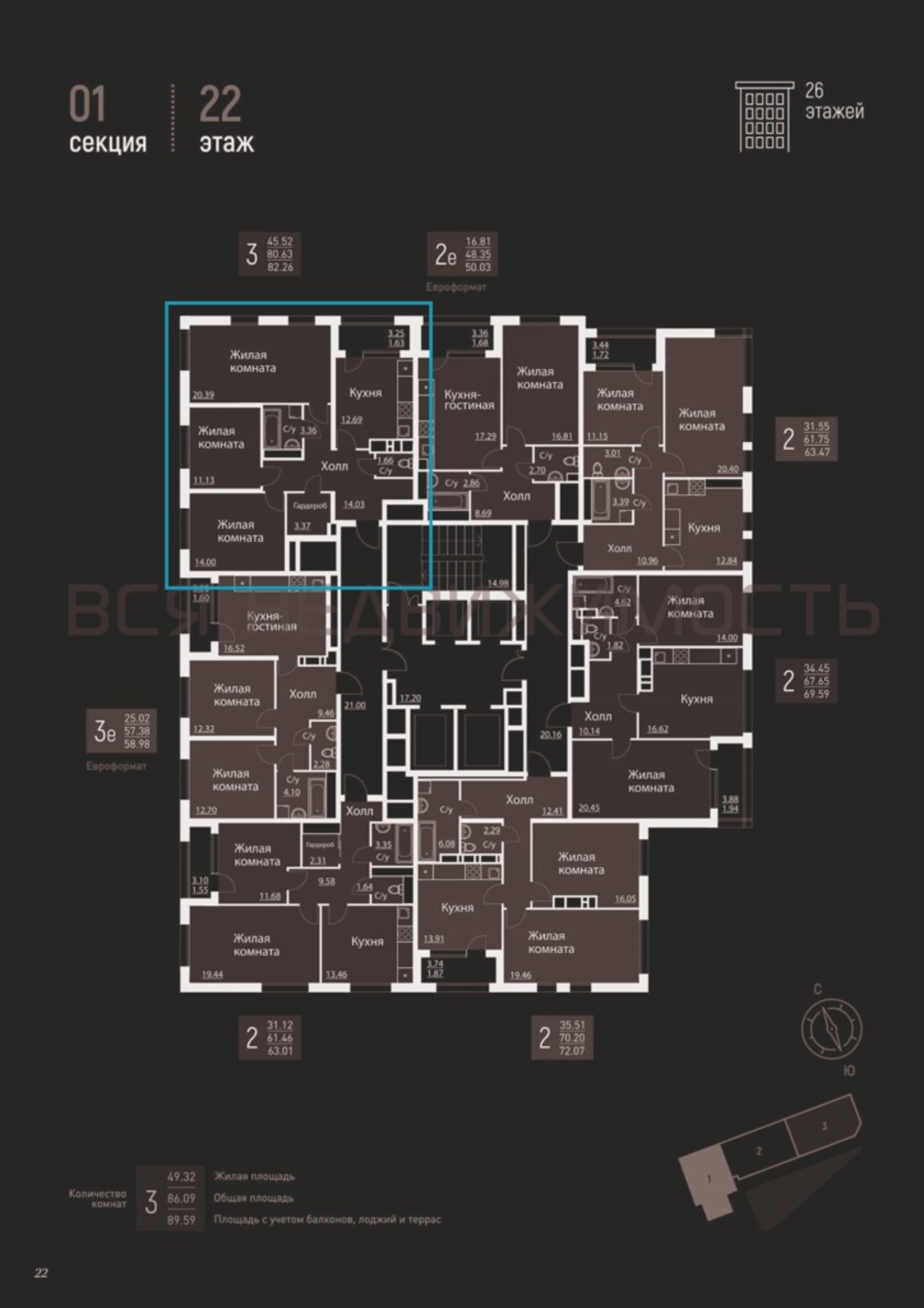 3-комнатная квартира, 82.53 м² 22/25 этаж ID объекта 77884