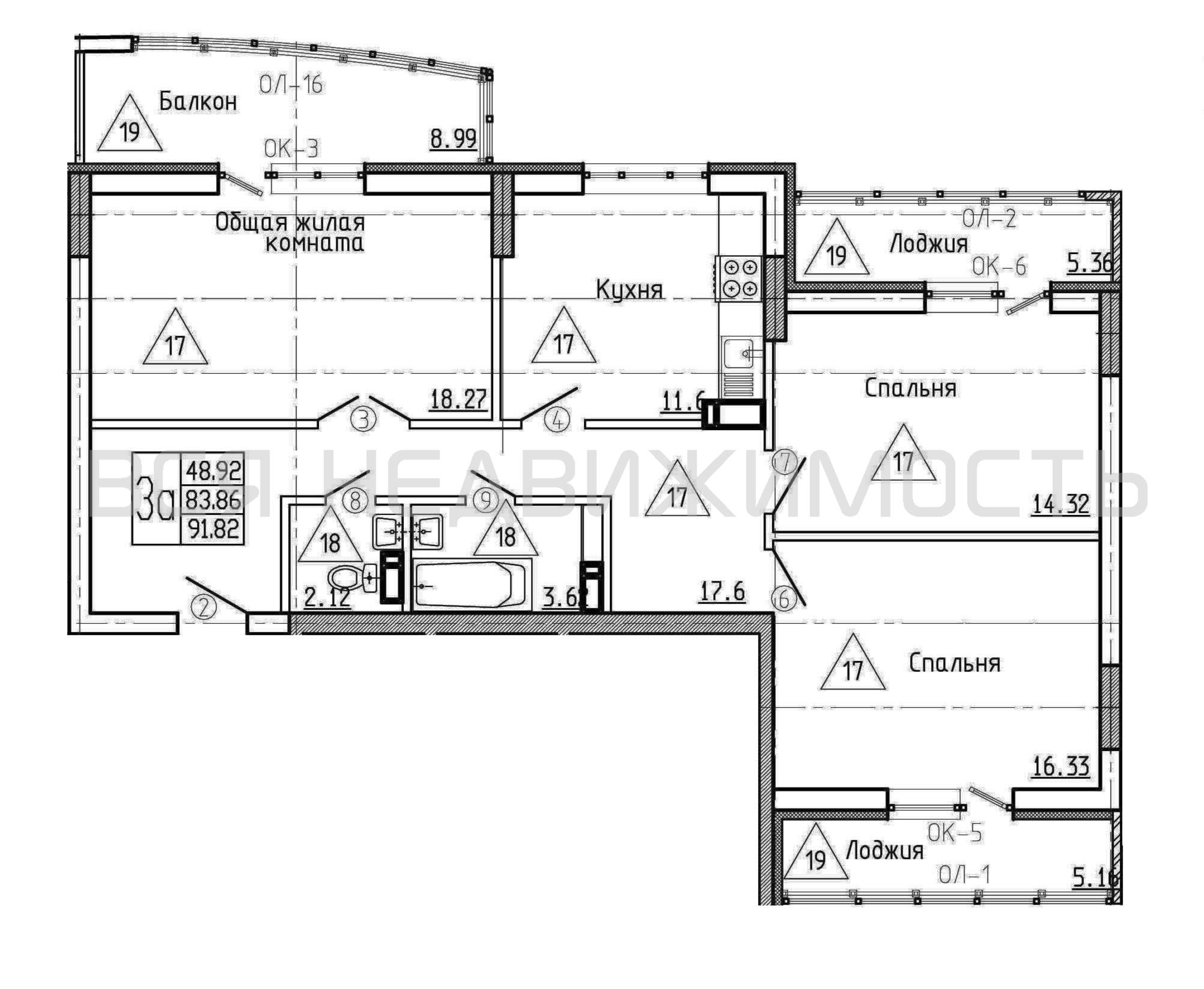 3-комнатная квартира, 83.40 м² 10/17 этаж ID объекта 4615