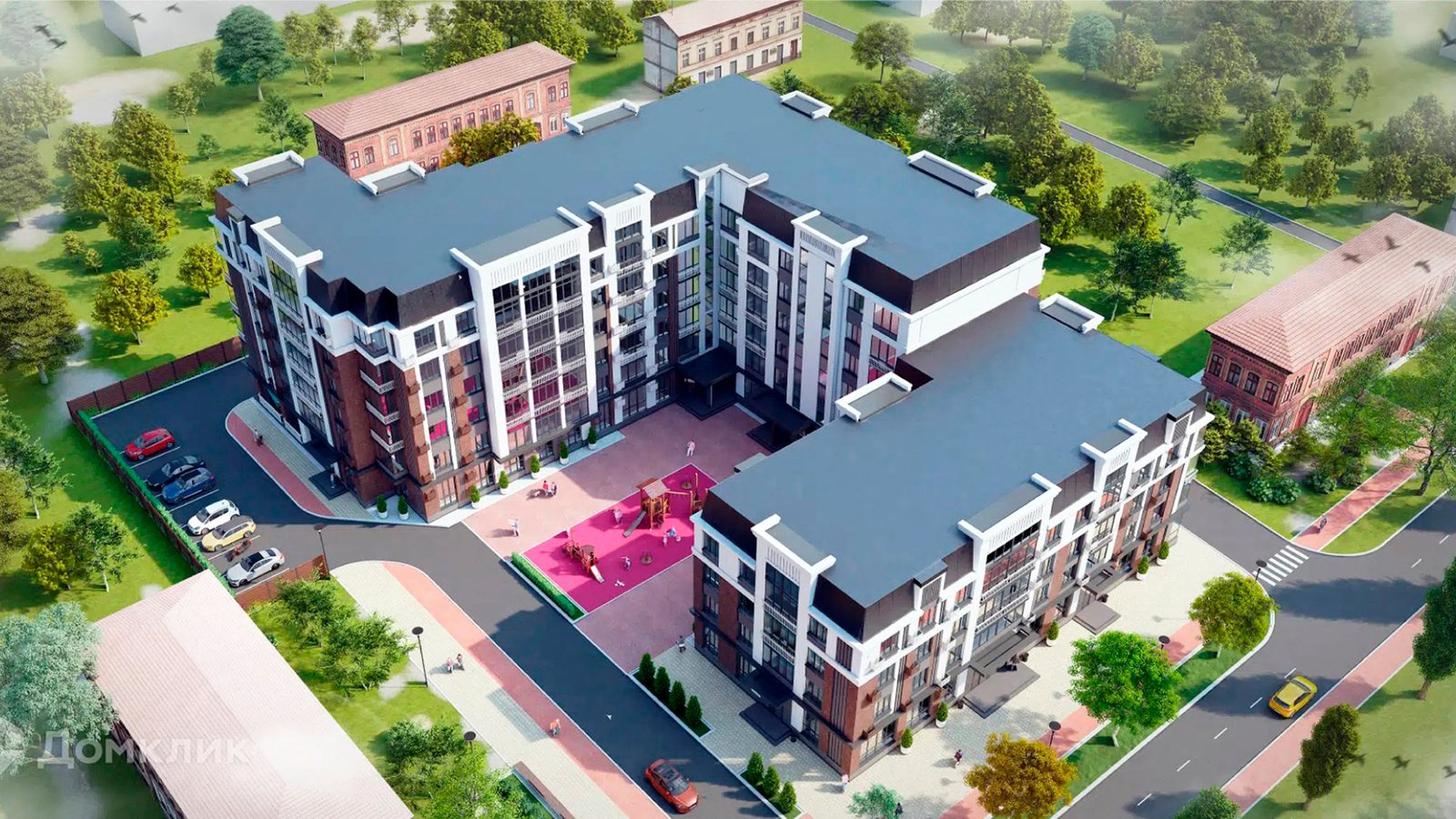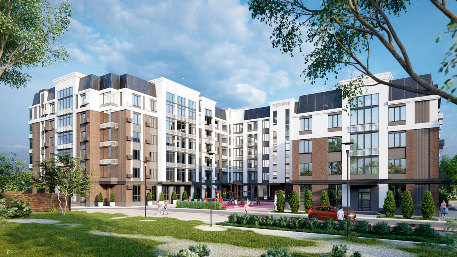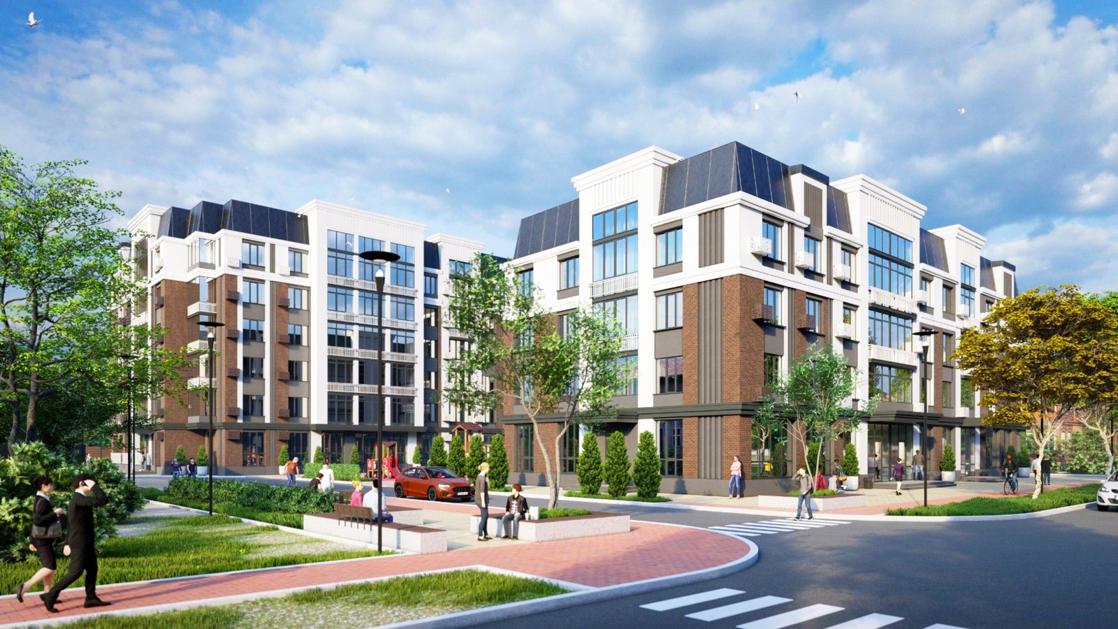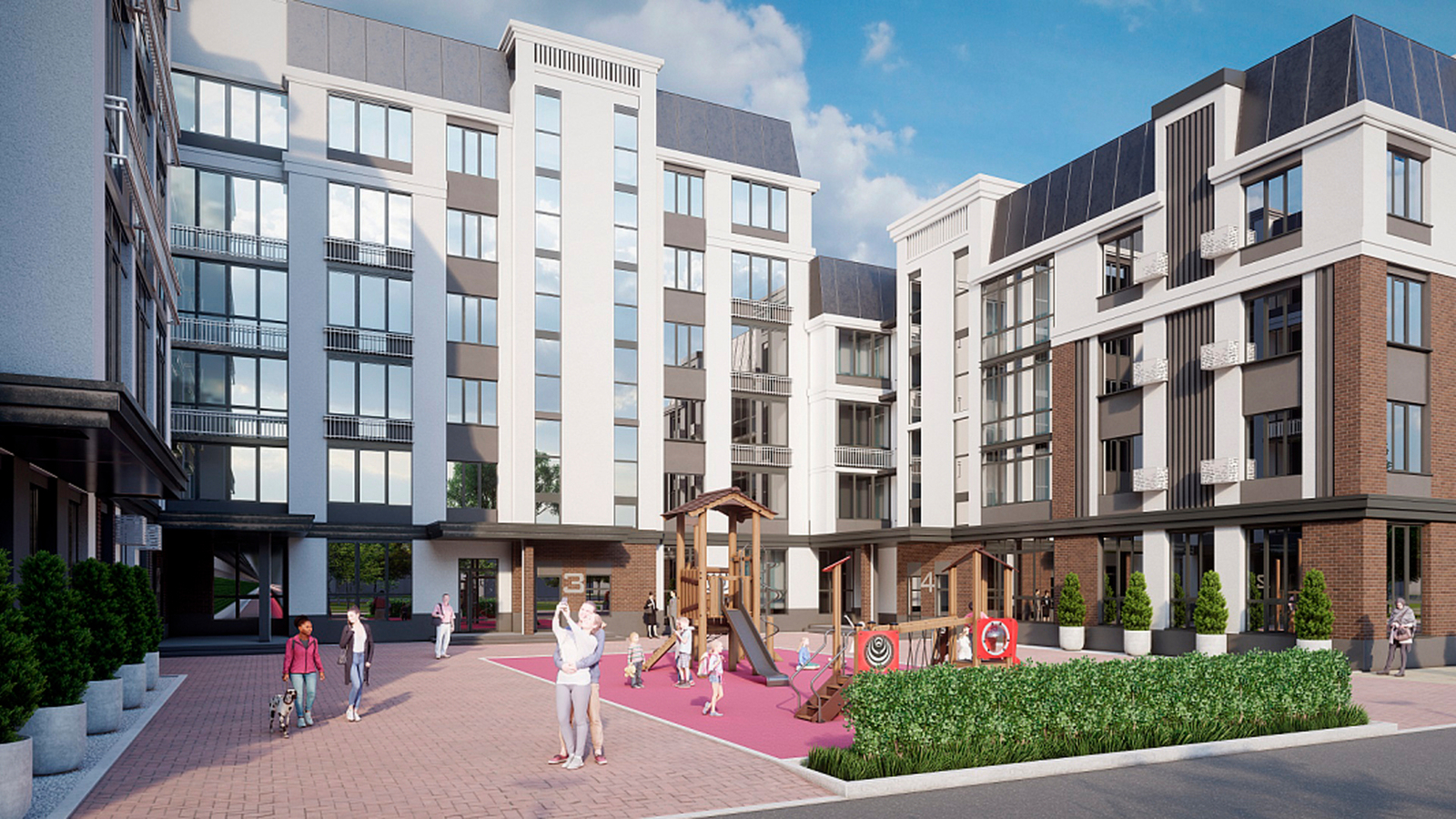 Территория клубного дома «Дом офицеров» закрыта от посторонних и полностью освобождена от автомобильного движения, что создает идеальную среду для отдыха и прогулок. Архитектурная геометрия дома способствует созданию закрытого, защищенного внутреннего двора, где жители могут наслаждаться покоем и приватностью, отдыхая с книгой или проводя время с детьми.