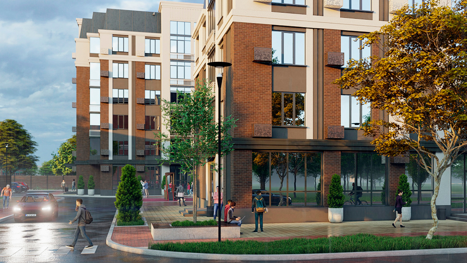 Входные группы выполнены с особым вниманием к деталям: многоуровневое освещение теплых оттенков и декоративные элементы придают им атмосферу уюта и комфорта, делая их продолжением жилых помещений.
