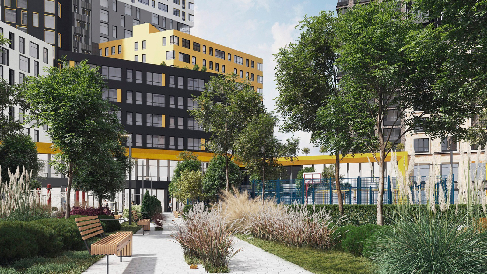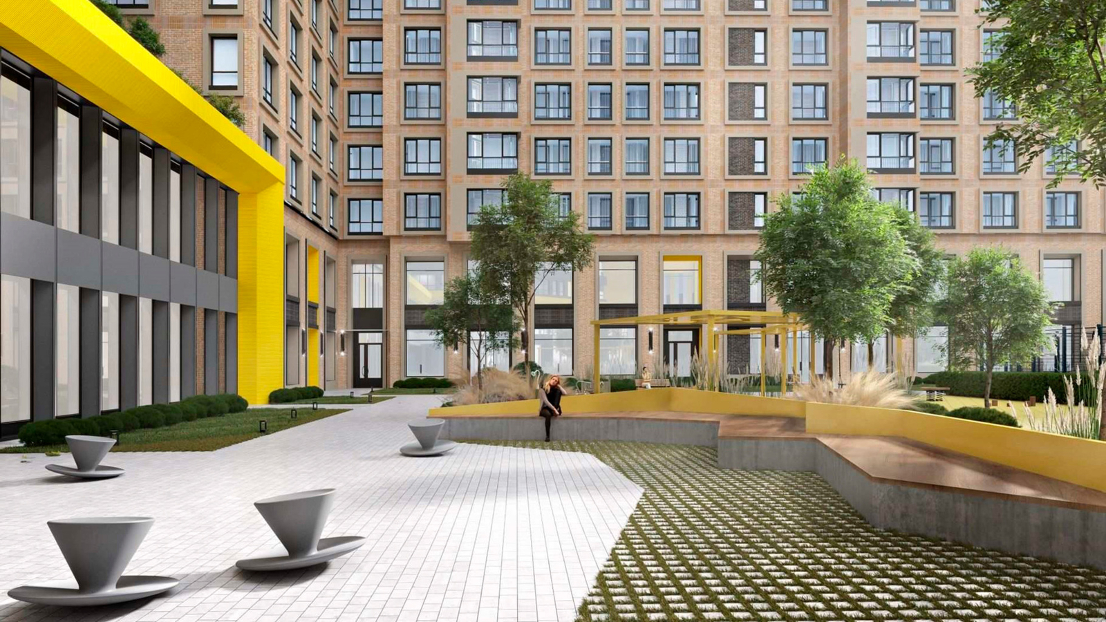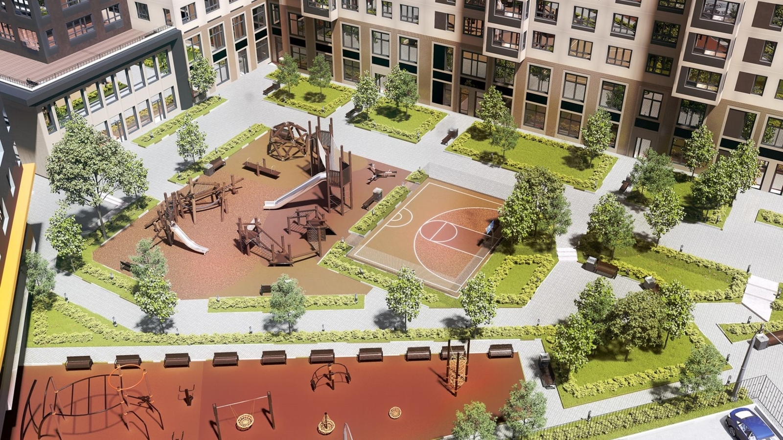 Закрытая территория комплекса создаст ощущение приватности в самом центре мегаполиса, а концепция «двор без машин» предоставит в распоряжение жителей уютное дворовое пространство с зонами как для отдыха, так и для общения, встреч, нетворкинга: главная площадь с елью, небольшой дворовый сквер, центральная пешеходная аллея для прогулок, детские игровые и спортивные площадки, зона уличных тренажеров.